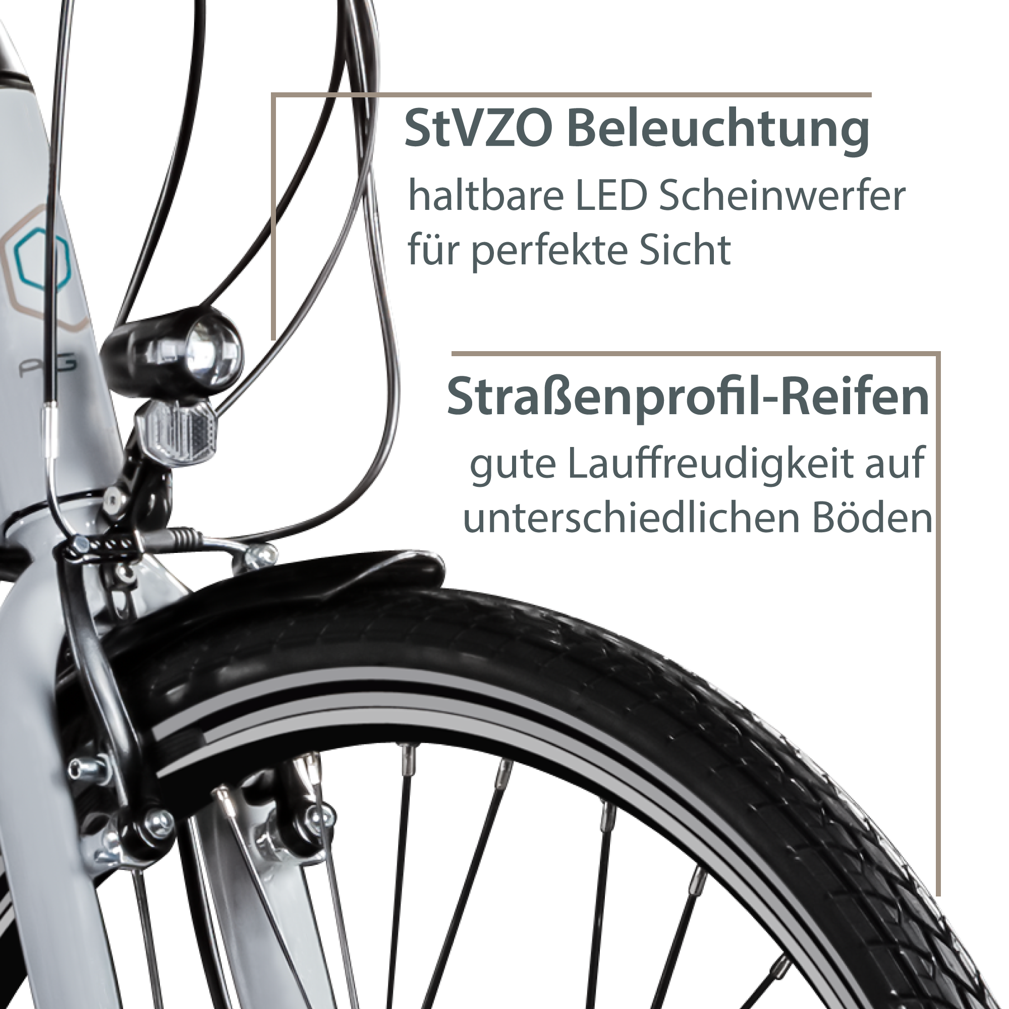 Das Stadtrad wird mit kräftigen V-Brakes gebremst und besitzt außerdem eine Rücktrittbremse. Diese Felgenbremsen greifen zuverlässig und präzise und benötigen dabei nicht viel Wartung – nur die Bremsbeläge müssen ab und zu gereinigt oder getauscht werden, wenn sie abgefahren sind. Die laufruhigen 28 Zoll Räder mit leichten Aluminium Doublewallfelgen sind mit Reifen mit Straßenprofil und Reflexstreifen bezogen, die nicht nur für besseres Gesehen-Werden im Straßenverkehr sorgen, sondern auch Katzenaugen entbehrlich machen.