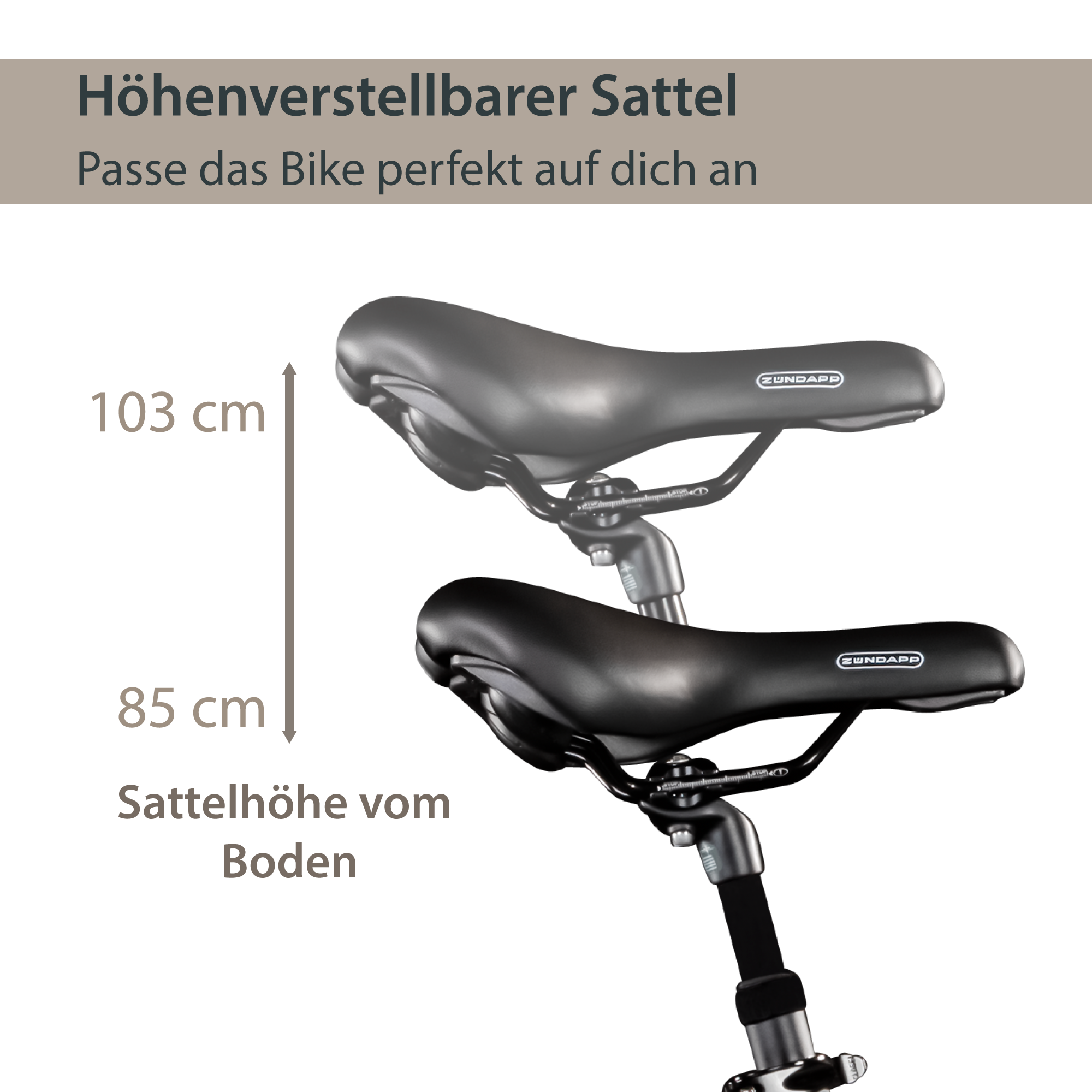 Der leichte Aluminiumrahmen mit tiefem Einstieg ermöglicht ein müheloses Auf- und Absteigen in den gepolsterten Sattel. Die Rahmenform sorgt für eine aufrechte, bequeme Sitzposition, unterstützt durch den nach hinten gekröpften Citylenker. Dank des winkelverstellbaren Vorbaus lässt sich die Lenkerposition individuell anpassen. Die Starrgabel besitzt den Vorteil, dass sie vollkommen wartungsfrei ist. Für zusätzlichen Fahrkomfort sorgt die gefederte Sattelstütze, die du in der Höhe anpassen kannst.