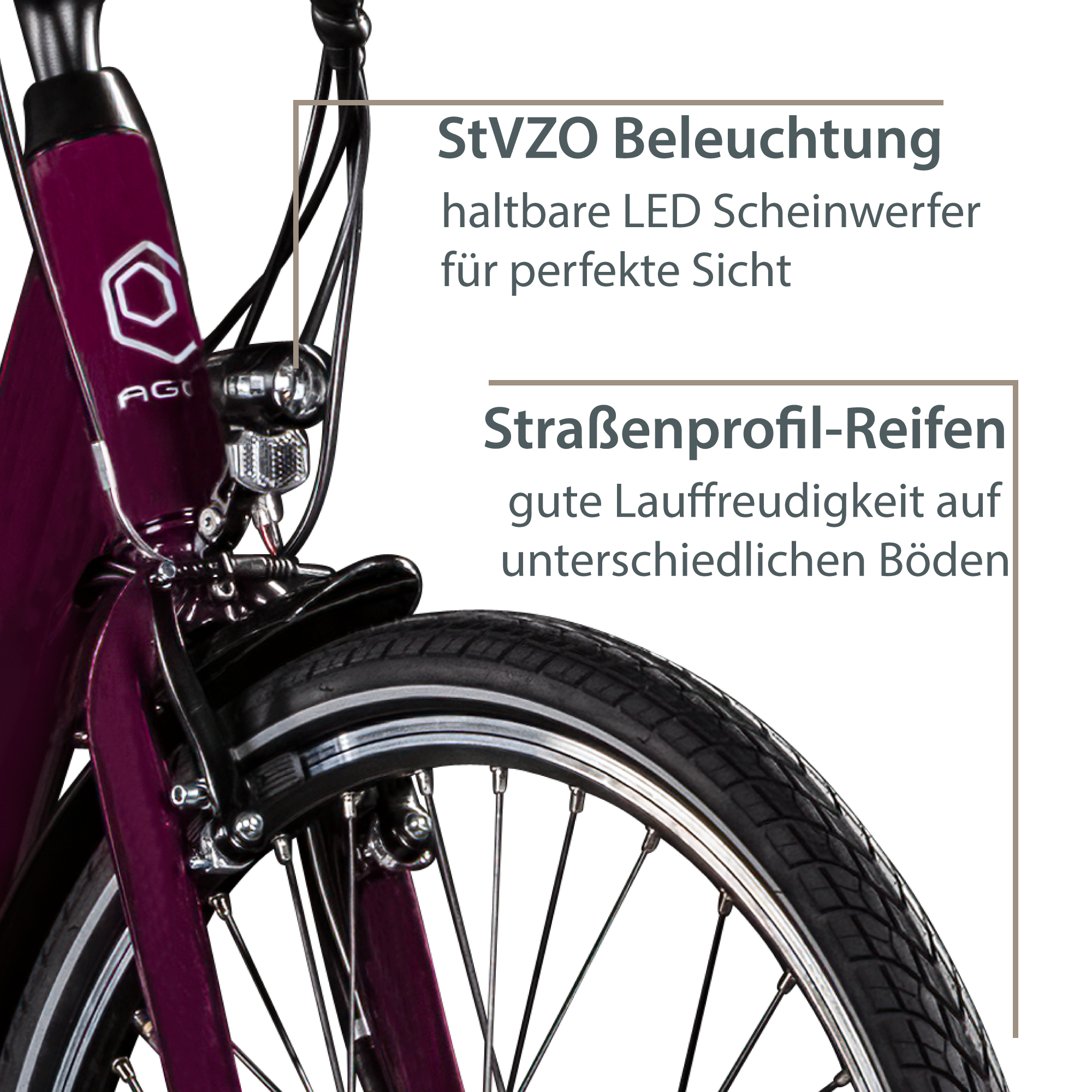 Damit du gleich startklar bist, wird der Tiefeinsteiger mit viel Zubehör geliefert: Für perfekte Sicht bei trüber Witterung oder Dunkelheit ist eine StVZO-konforme LED Beleuchtung mit dabei. Neben Schutzblechen, einem Kettenschutz und dem Fahrradständer wurde auch ein Gepäckträger integriert, auf dem du Gegenstände oder Einkäufe transportieren kannst.