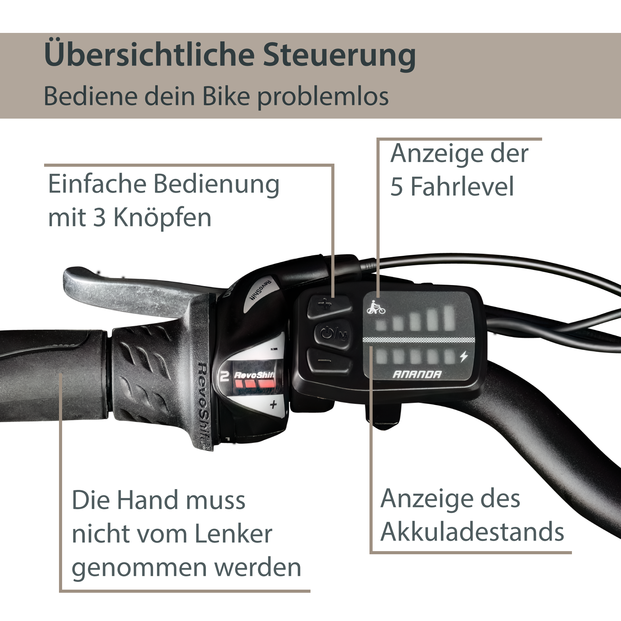 Der Ananda Nabenmotor am Vorderrad unterstützt kraftvoll mit 250 Watt und 40 Nm für ein natürliches Pedaliergefühl. Das übersichtliche Ananda LE-Display bietet Überblick über fünf Fahrmodi, Schiebehilfe und Akkustand, ohne abzulenken. Die Energie erhält das E Fahrrad von einem 374,4 Wh starken Sitzrohrakku, der eine Reichweite zwischen 30 und 115 km ermöglicht. Da neben dem Gesamtgewicht auch das gewählte Unterstützungslevel, die Geländebedingungen und Wetterverhältnisse wie beispielsweise Gegenwind Einfluss nehmen, ist eine exakte Angabe der Reichweite von E-Bike Akkus kaum möglich. Unsere Angaben sollen daher als Richtwert verstanden werden.